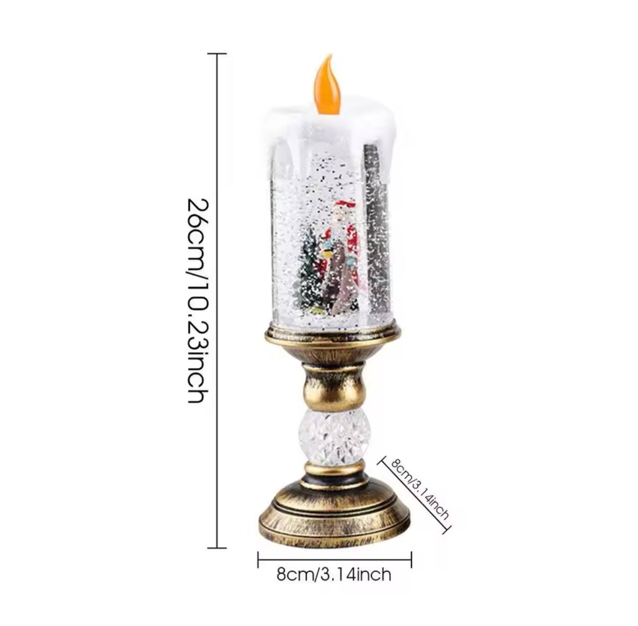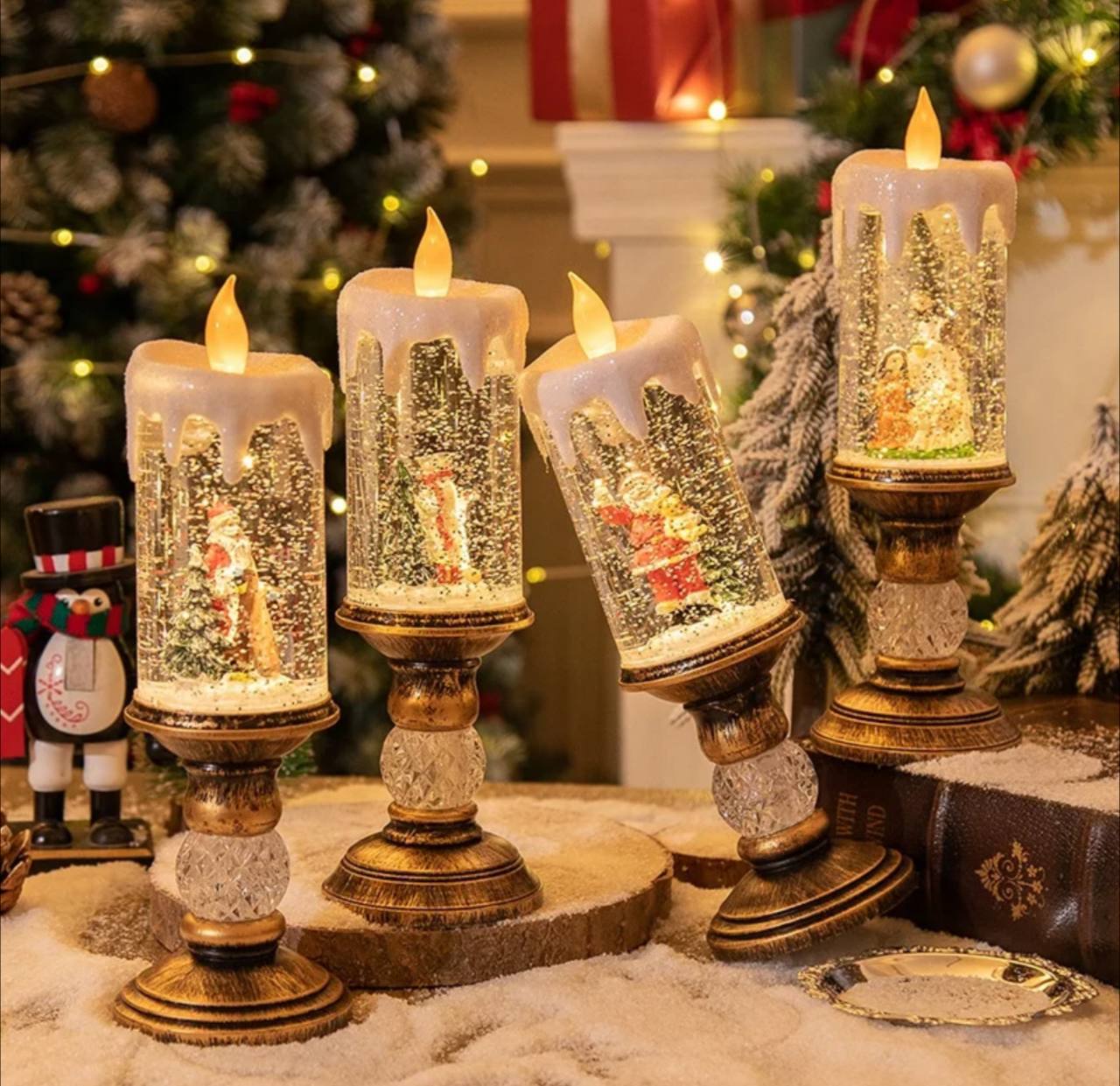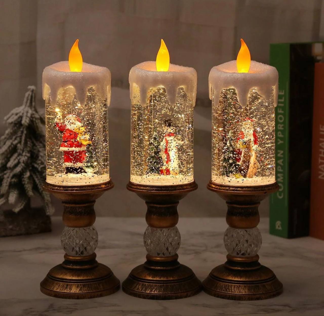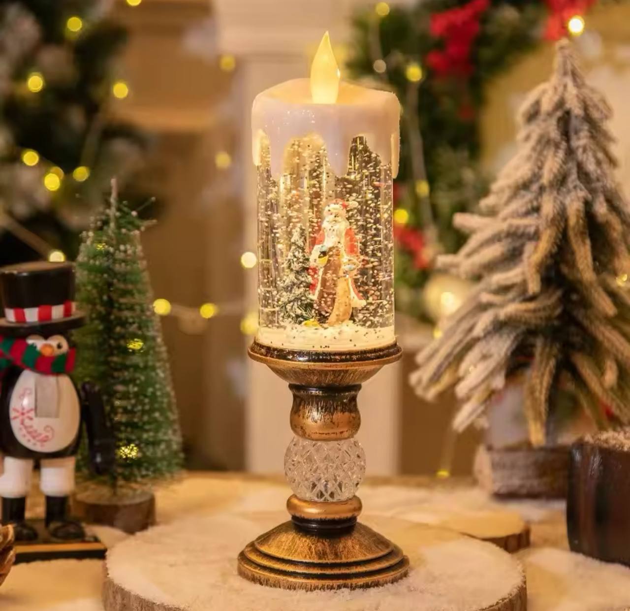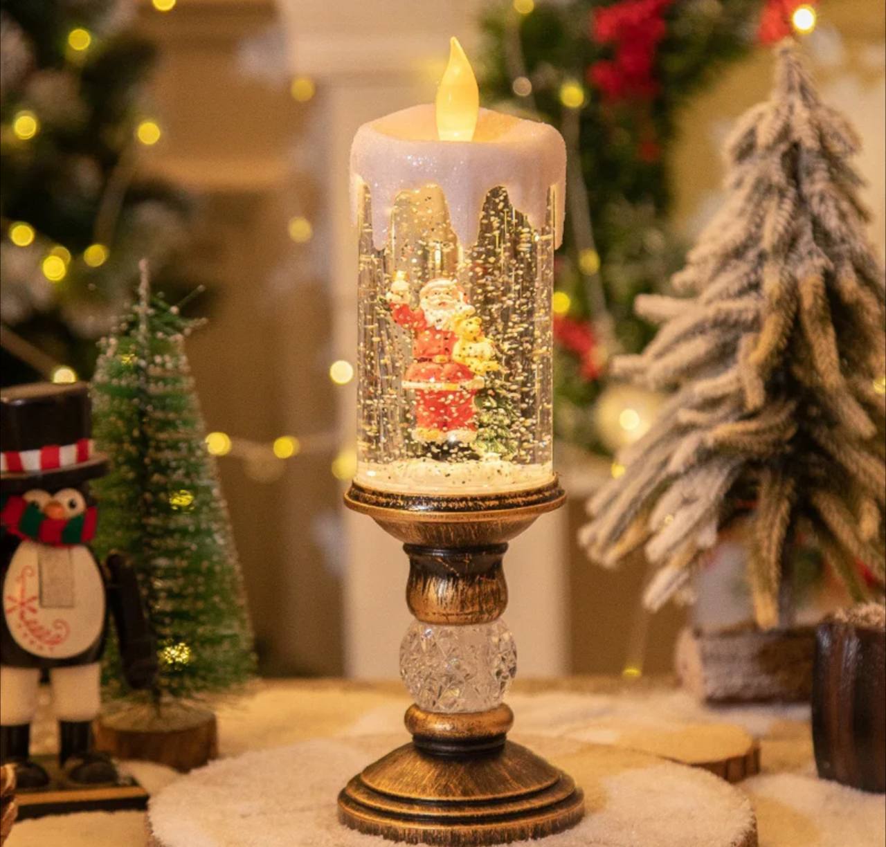 Tiene un efecto de nieve y dentro un muñeco navideño